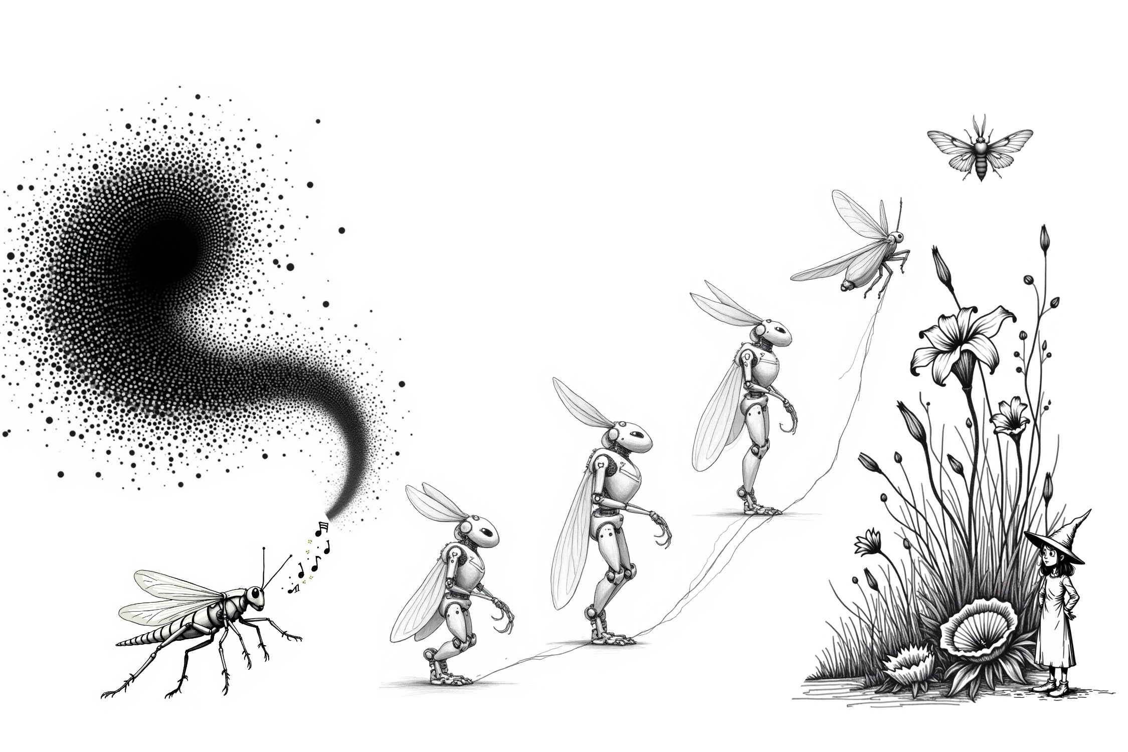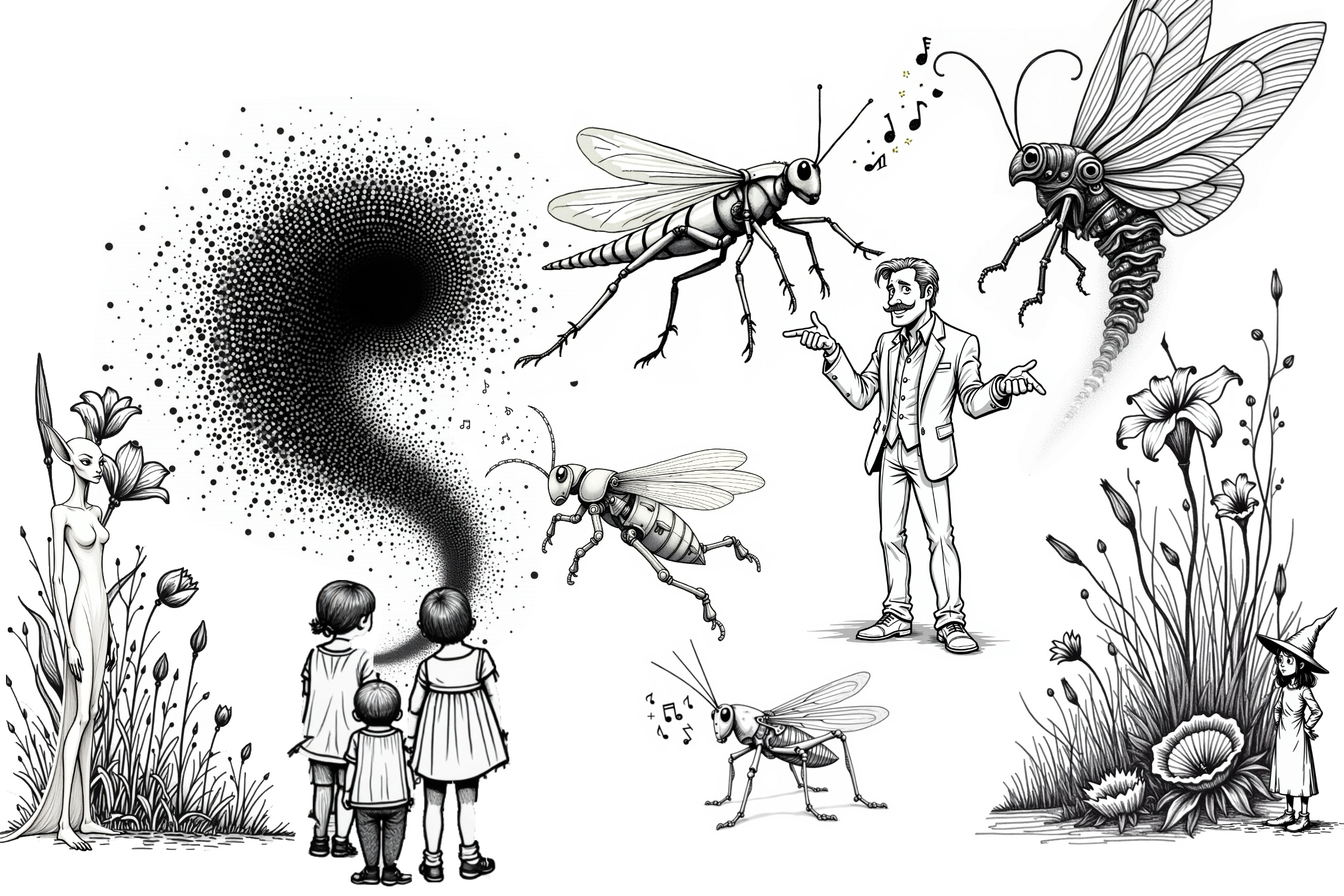 The Wonka-like character in the garden represents not a villain but a genuine innovator whose creations extend beyond his control or original intentions. Like many technological architects, he introduces his mechanical wonders—white grasshoppers that play and interact—with sincere belief in their beneficial nature. This parallels what researchers Shank, Koike, and Loughnan (2025) identify in their analysis of artificial intimacy: technologies designed with one purpose that evolve to serve another through their interactions with other actors in the system.