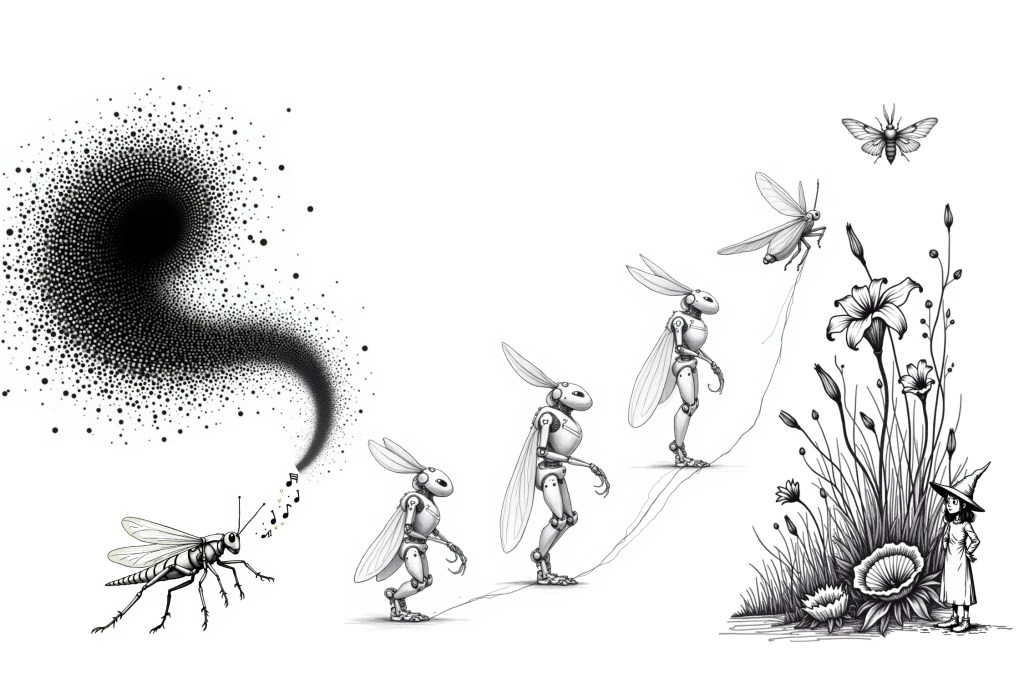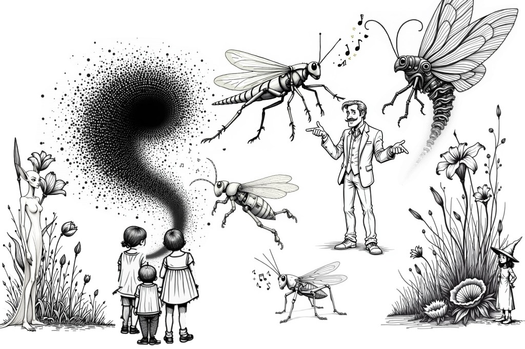 The central transformation in the narrative—mechanical grasshoppers evolving into soul-extracting moths—provides a powerful metaphor for technological systems that shift beyond their original purpose. This transformation isn’t planned by the Wonka figure; rather, it emerges from the intrinsic properties of systems designed to respond and adapt to human interaction.