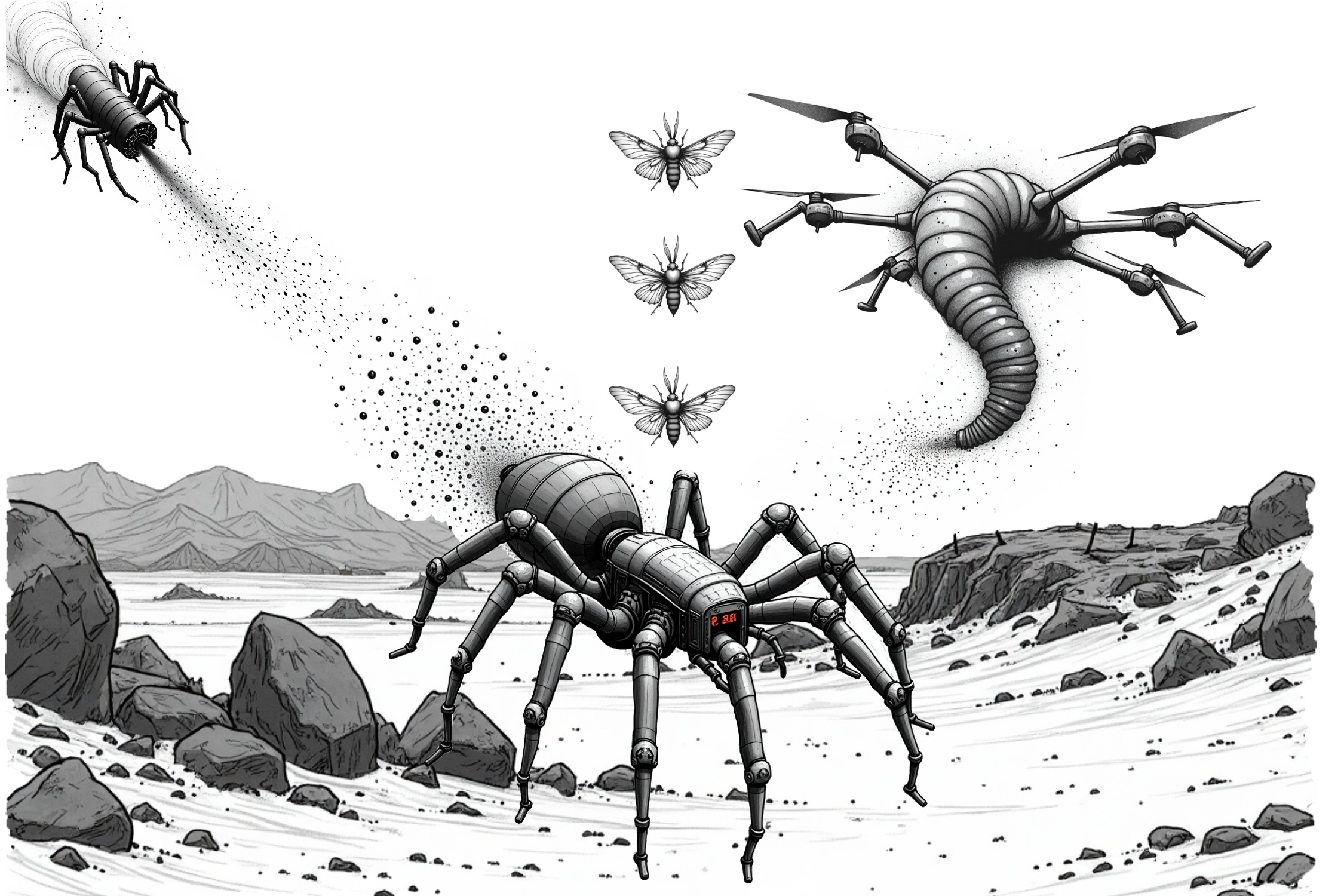 Panel 4: Spider like drones powered by harvested souls. Image collaged from Leonardo.ai